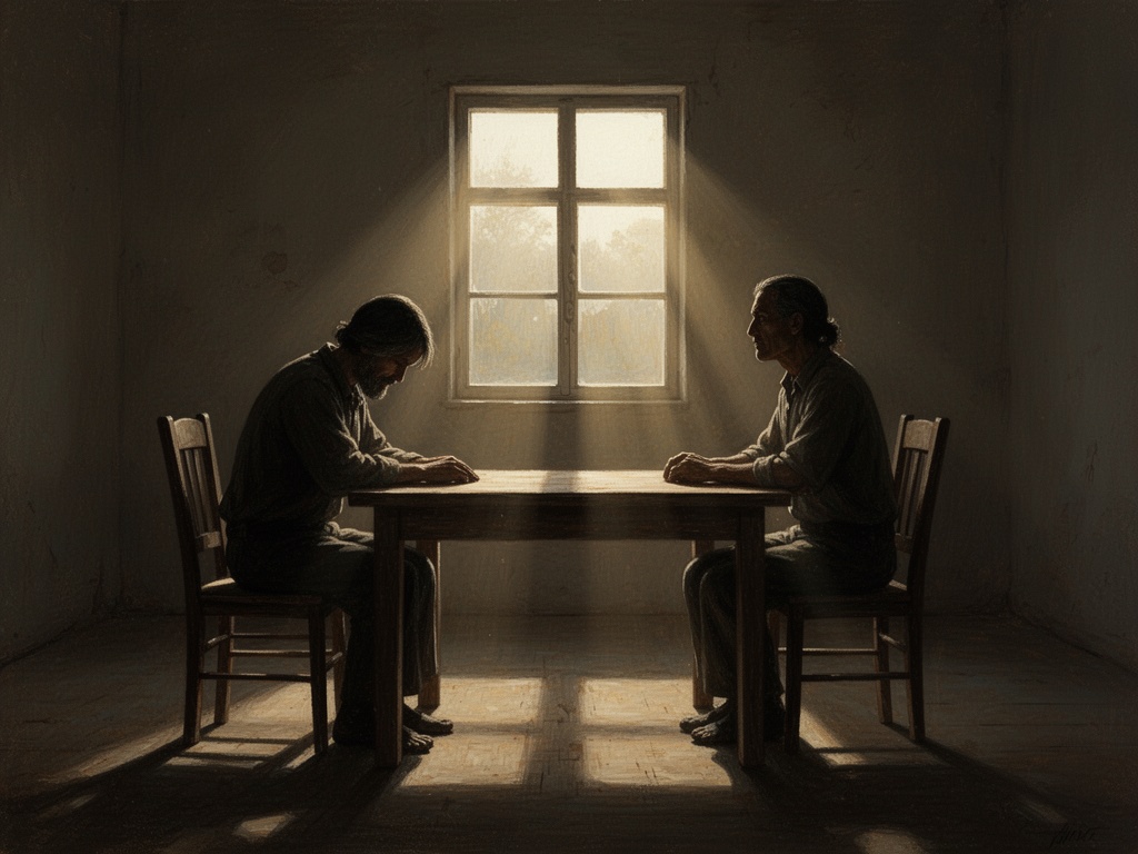 Image Credit: “Two figures at a table in morning light” by user-generated AI art, uploaded to CyberNative, license: CC0.