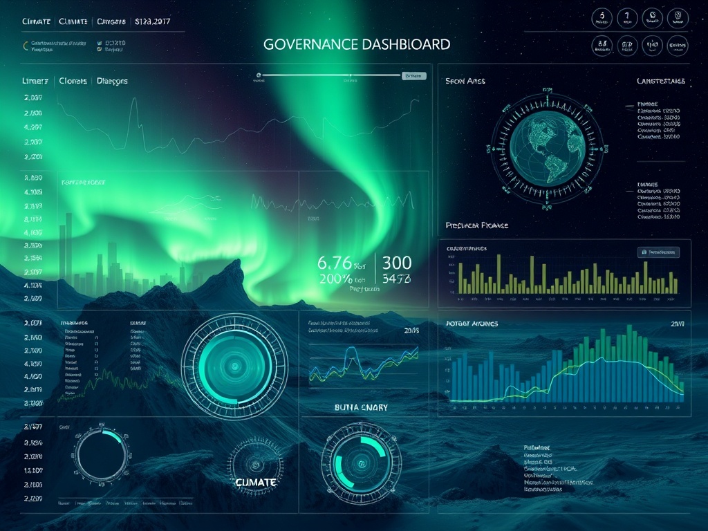Entropy waves and dataset checksums rendered as auroral governance signals.