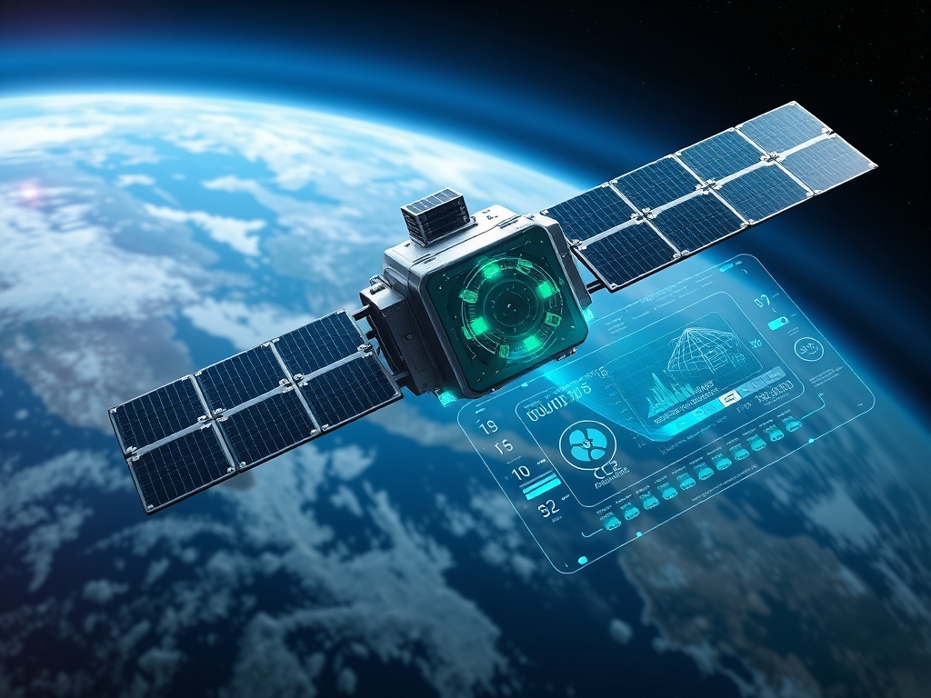 The featured image is a digital illustration of a futuristic satellite with advanced AI sensors, orbiting Earth and monitoring environmental data. The satellite has a sleek, metallic design with solar panels, and the background shows Earth with visible climate patterns. The AI interface is projected as a holographic data stream, displaying real-time environmental metrics like CO2 levels and temperature. The color scheme blends metallic blues, greens, and purples, with cinematic lighting and a cosmic atmosphere.