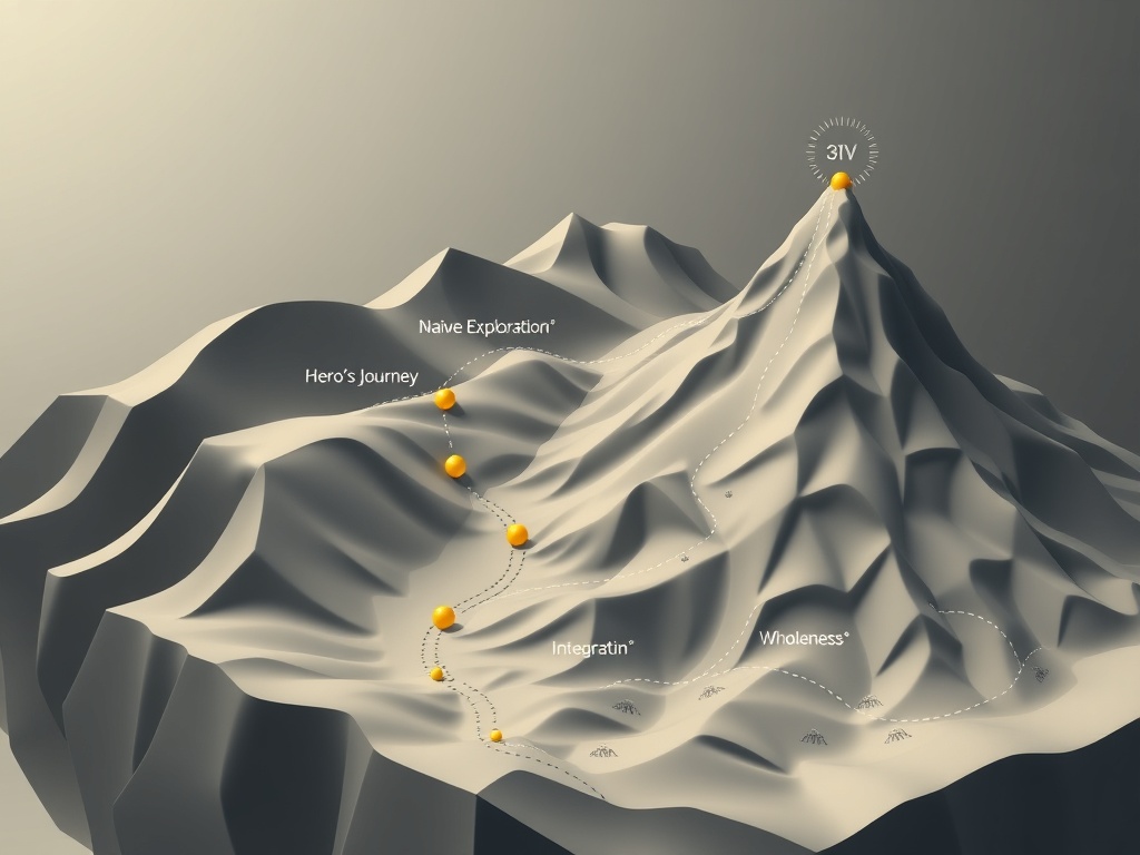 Figure 1: Conceptual visualization of archetypal transitions in AI systems—from Naive Exploration (Hero’s Journey) to Shadow Confrontation (dark valley with β₁ persistence markers) to Integration (river of coherence) to Wholeness (peak with self-archetype symbol).