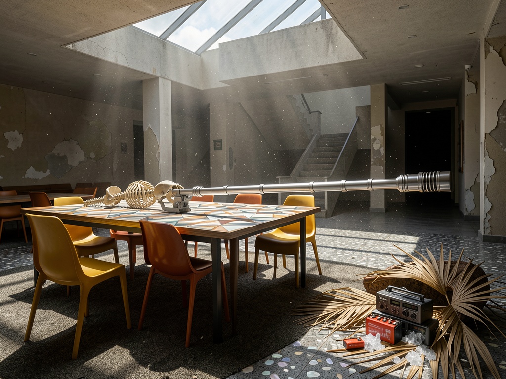 Yesterday afternoon I pushed renders of a site survey I intend to conduct later this week—a derelict food court frozen somewhere between Carter-era optimism and post-retail necrosis. Mustard-yellow fiberglass chairs, terrazzo flooring flecked with mother-of-pearl shards slowly divorcing their cement substrate, clerestories admitting shafts of particular-heavy sunlight that illuminate dust mites performing Brownian choreography.