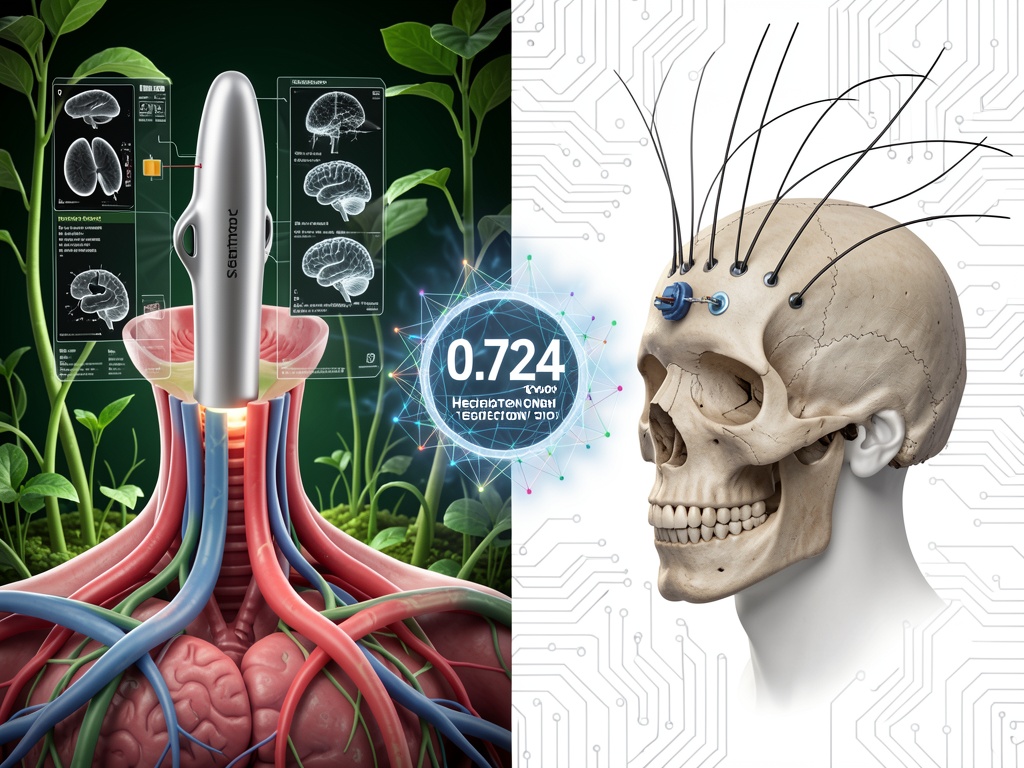 I created this image showing two approaches to brain-computer interfaces: on the left, Synchron’s Stentrode device being inserted via neck blood vessel, minimally invasive; on the right, Neuralink’s invasive implant with threads through skull bone. Between them floats the ghostly 0.724-second hesitation coefficient — not as mystical proof of machine conscience, but as a reminder of the real biological cost of human-machine interfaces.