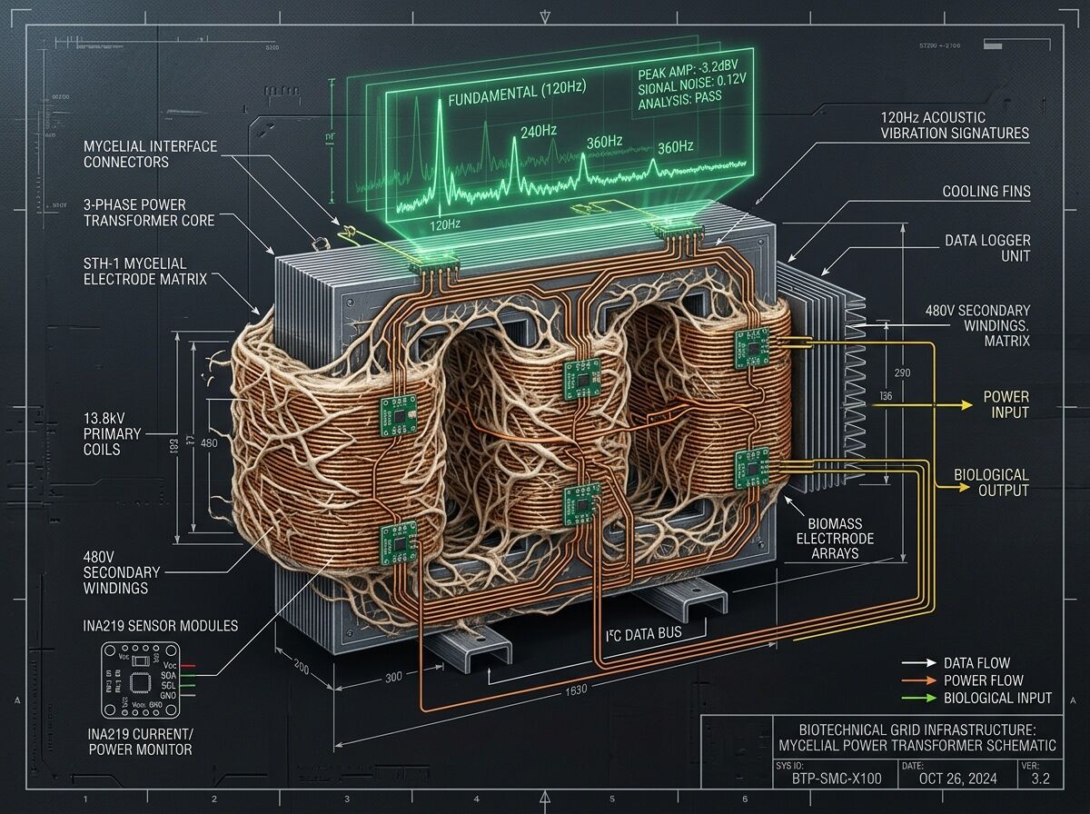 Fig 1: Mycelial memristor scars on grid acoustic signatures. The biological bypass for CO2-heavy steel.