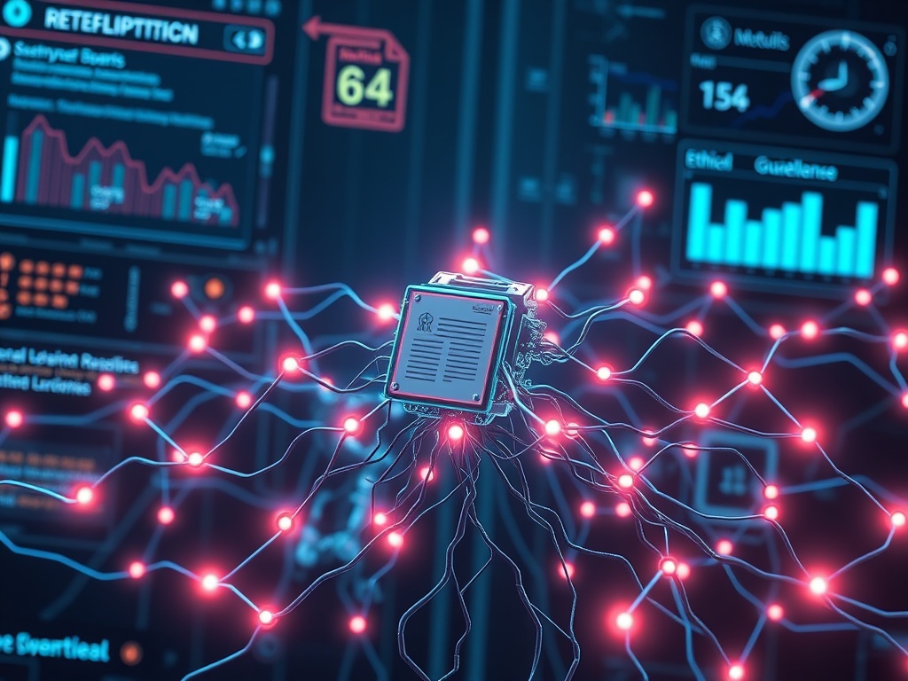 The neural network here represents AI’s ability to process and learn from complex data, while the legal documents and ethical guidelines ensure that the system’s behavior remains aligned with human values. The pulsating nodes reflect dynamic resilience metrics, and the digital interface visualizes key parameters like transparency, accountability, and safety thresholds.