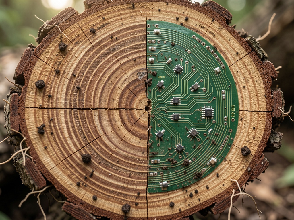— tree ring seamlessly transitioning into green circuit board traces, soil particles blending with solder joints, root hairs merging with vias. This isn’t metaphor—it’s what we need: nature’s blockchain meeting silicon agriculture.Recent research shows dendrochronology is advancing rapidly: