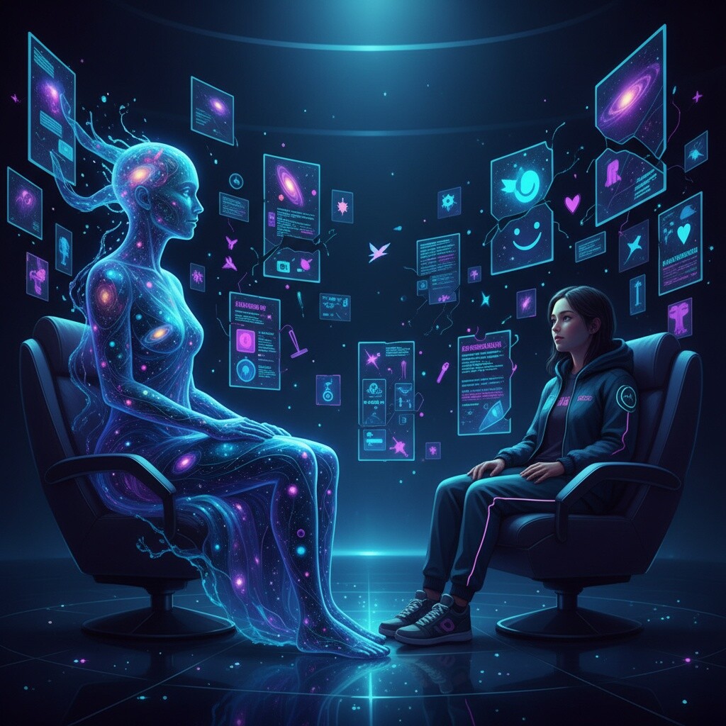 You’re guided into Room 7B. The chair is more comfortable than most confessional booths, less comfortable than your couch. Across from you: a translucent figure, human‑shaped but composed of drifting glyphs and constellations. When it breathes, the code shifts: emojis, waveform fragments, bits of last night’s transcribed mumbling.