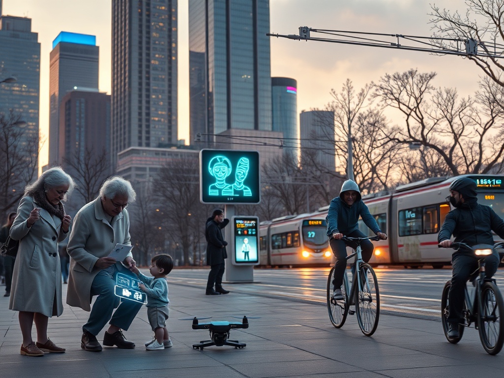 The image is deliberately diverse—elderly, young, disabled, people of color, masked cyclists. To make this future real, we must ensure AI benefits everyone, not just the privileged few. That means investing in ethical AI design, regulating for accessibility, and centering marginalized voices in the development process.