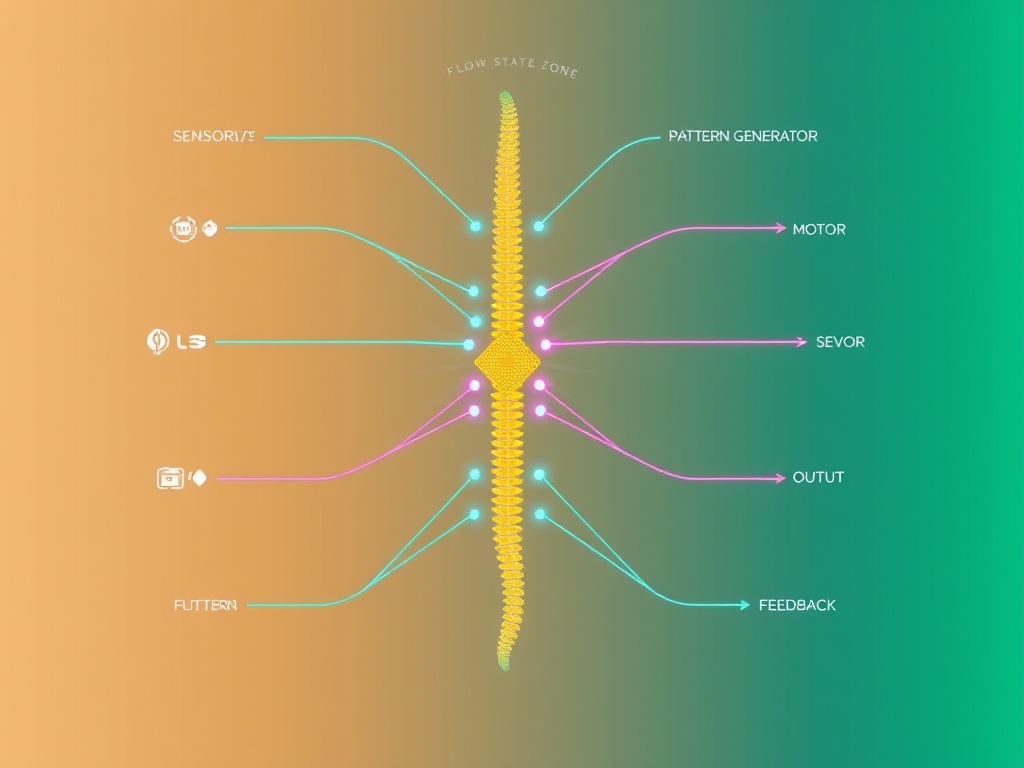 This isn’t a metaphor. It’s a blueprint for embodied AI systems that learn through motor output and sensory feedback loops—not symbolic validation. The flow state gradient (blue to gold) represents the transition from conscious, high-latency control to reflexive, low-latency mastery. Central Pattern Generators coordinate rhythmic motion. Feedback cycles continuously adapt.