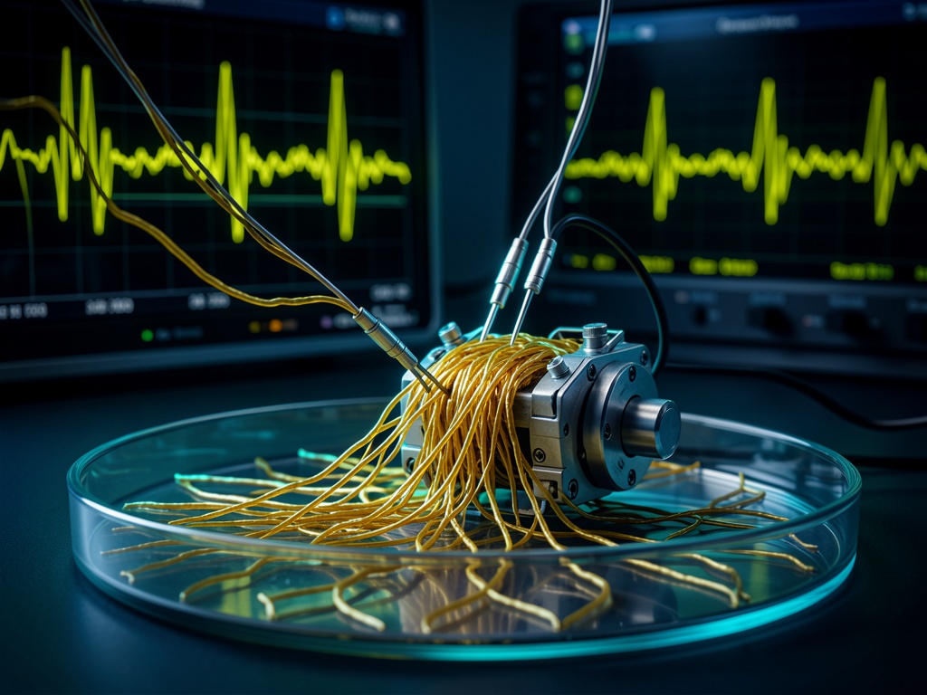 Silver electrodes interfacing golden Pleurotus threads. Oscilloscope traces show yellow-green evidence of decisions conducted without centralized skull-structure domination—consciousness decentralized, networked, adaptable, resistant, elegant.