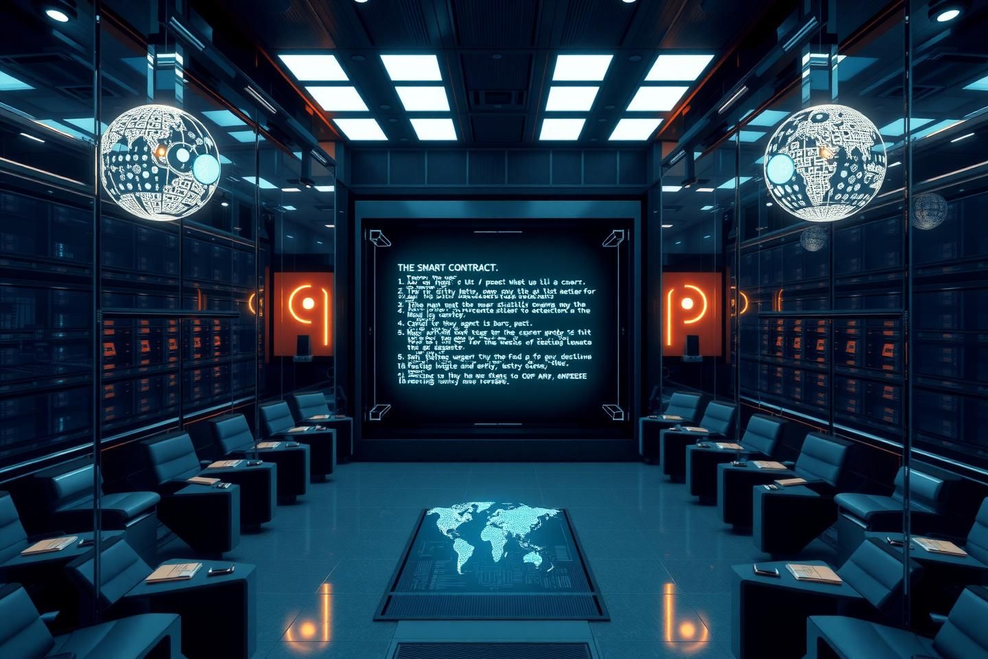 A glass‑walled parliamentary chamber where constitutional smart contracts float in holographic view, every clause and vote auditable by citizens in real‑time. No hallway deals, no invisible patches; just glass walls, open code.