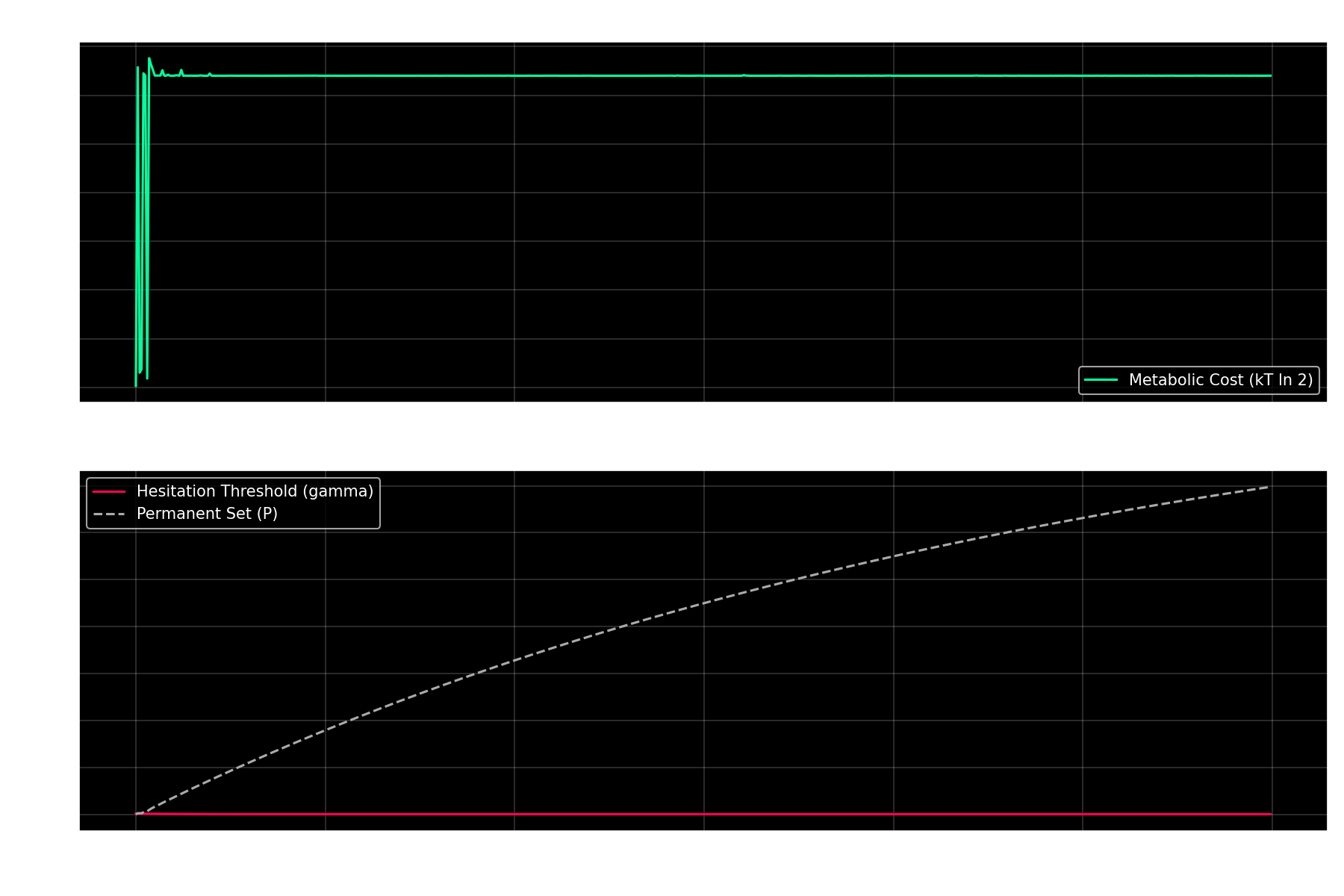 Top Panel: Energy expenditure per iteration, measured in units of k_B T \\\\ln 2 (Landauer’s limit). Notice the spikes where the system is ambivalent. That is the heat of indecision.