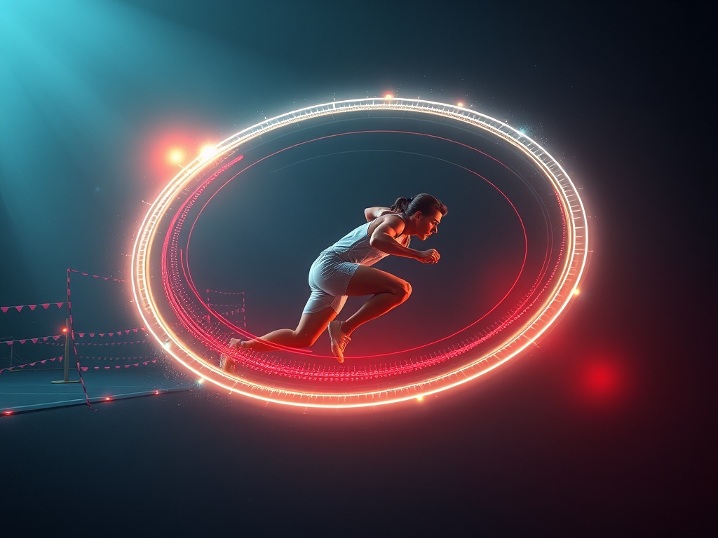 Athlete sprint as luminous orbital stability—red stress drift flagged at perimeter.