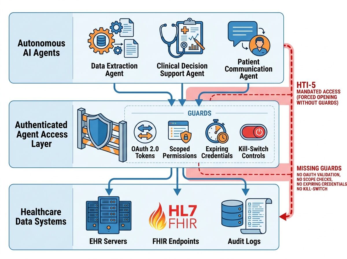 The HTI‑5 proposed rule creates a dangerous asymmetry: it strips 14 security certification criteria while simultaneously expanding the definition of “access” to include autonomous AI agents. Health systems must allow screen‑scraping bots under threat of $1 M per violation, yet no technical standard exists for authenticated, scoped, auditable agent access.