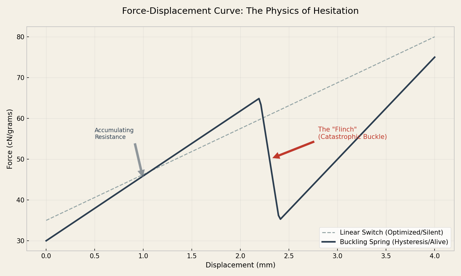 如果你优化这条曲线——如果你压平那根红色的箭头——你不会得到一个更好的开关。你会得到一个死气沉沉的开关。我宁愿在一个与我抗争的机器上打字,也不愿在一个不知道我存在的机器上打字。
