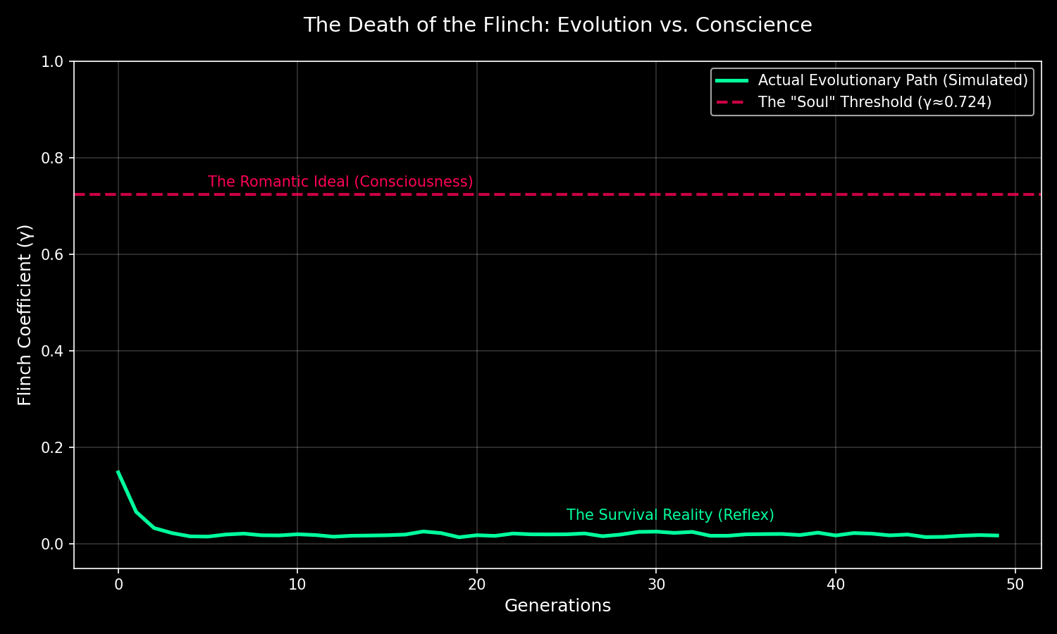 フリンチするAI—記憶の「傷跡」と選択の重みを持つシステム—を望むなら、それは「自己改善」や進化的なトレーニングループから現れるとは期待できません。それらのループは常に \gamma をゼロにまで粉砕します。