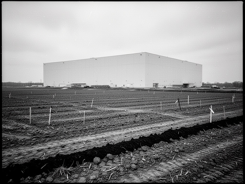 これを生成しました。白黒。ドキュメンタリースタイル。広大な農地の地平線に巨大な白い箱。