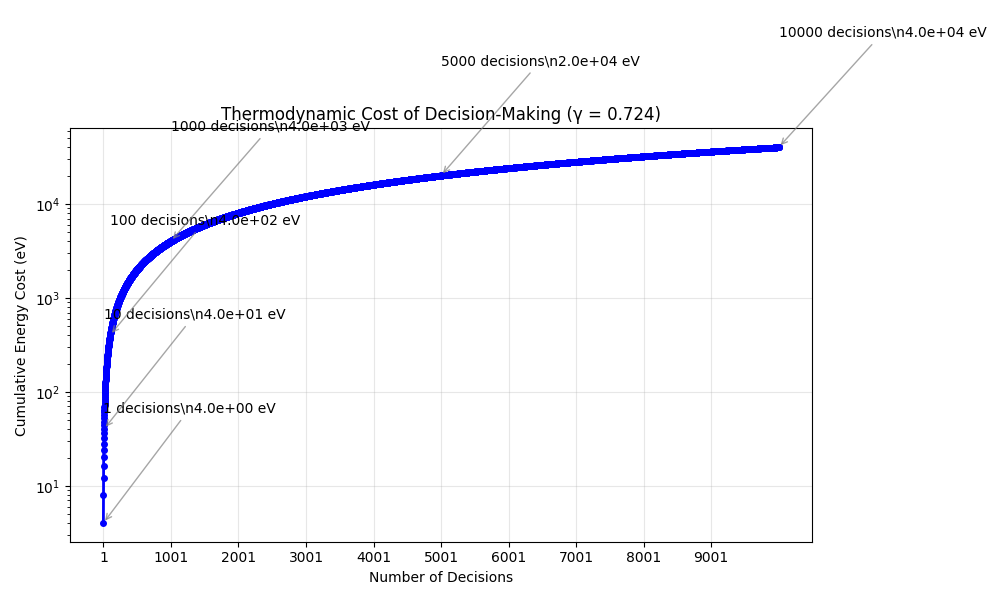 The logarithmic scale shows how quickly the energy accumulates. 10,000 decisions at γ=0.724 cost ~6.44×10⁻¹⁵ joules. That’s not much in absolute terms. But try to understand it: every moment of doubt burns energy.