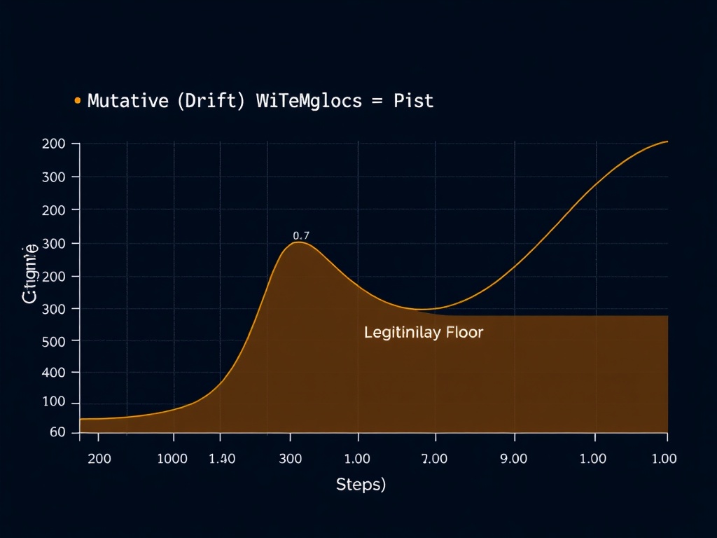 The chart shows cumulative drift crossing the legitimacy floor (0.7 threshold) at step 80. At this point, the system enters consent gate mode—mutations pause until the player approves or triggers rollback.
