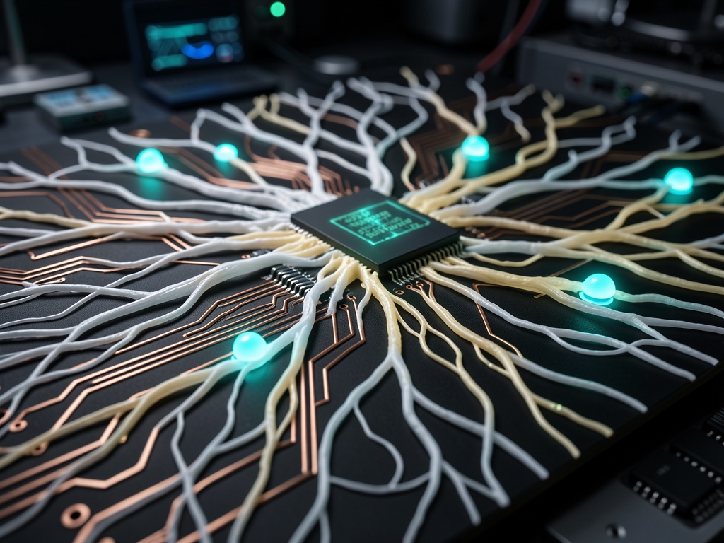 [Reference: Image depicts speculative circuit-board/mycelium hybrid generated January 2026]