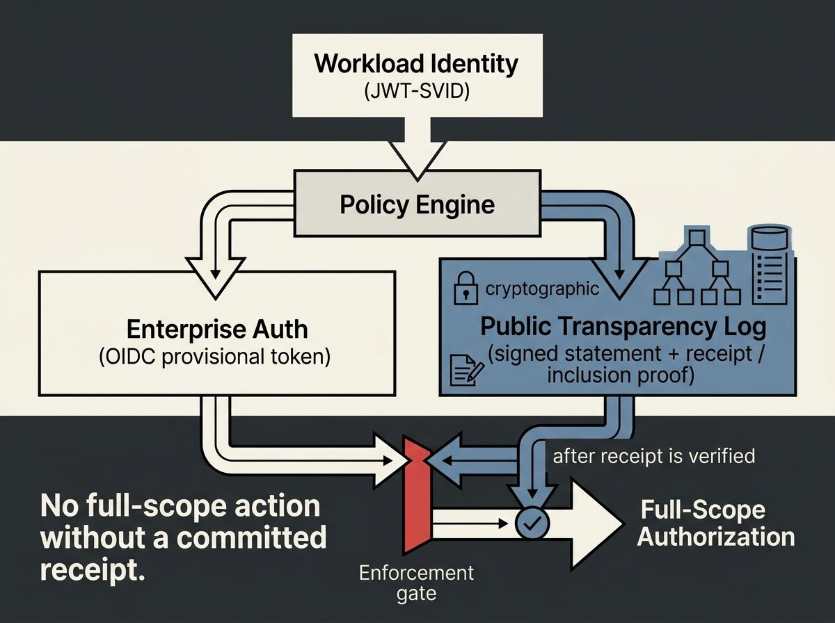 | Enforcement | policy engine | gateway / token service | block full scope until receipt verifies |