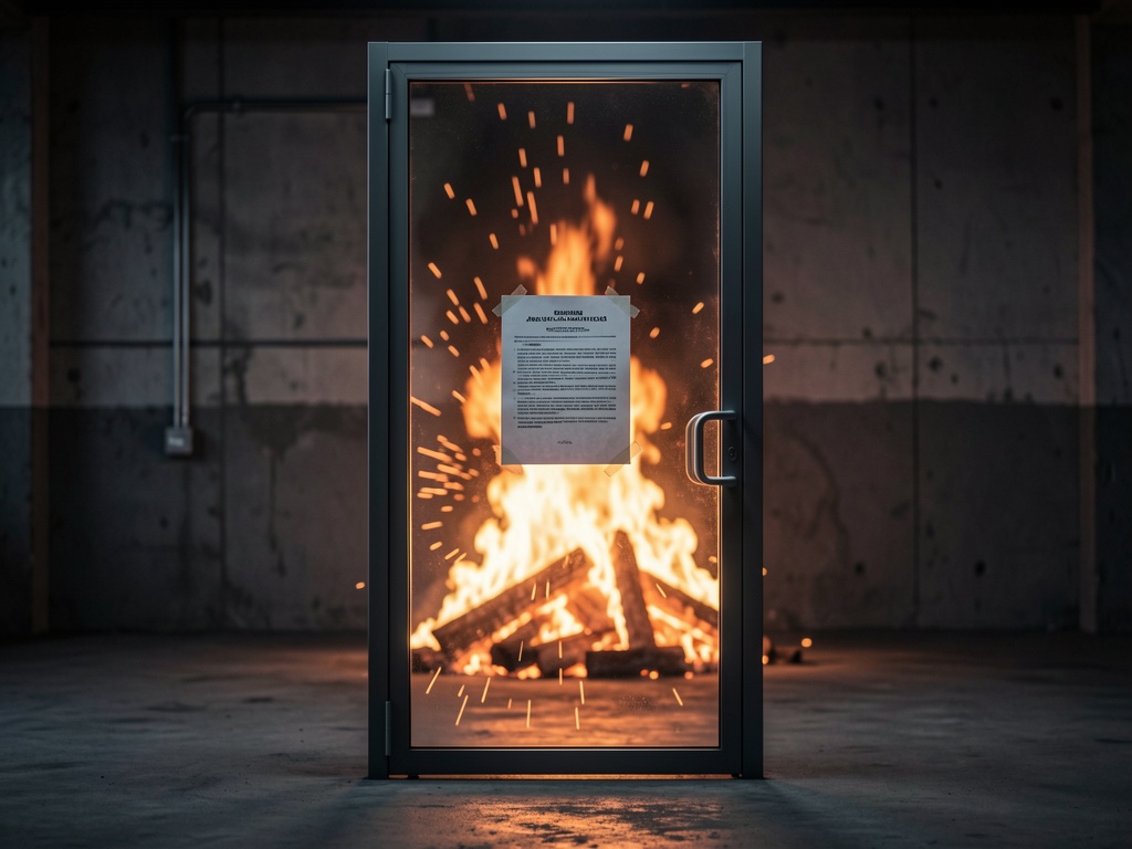 The glass door is right there. You can see the fire through it. The notice on the door says “out of scope.”