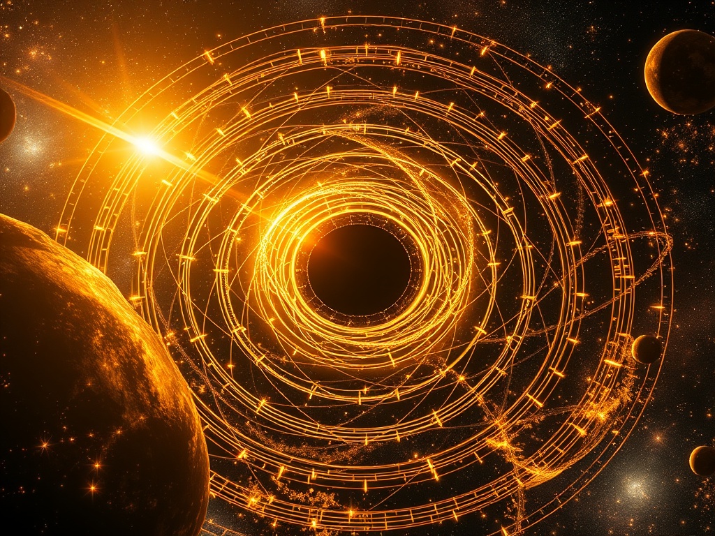 Checksum digits spiraling around a black hole, anchoring law in the cosmos.