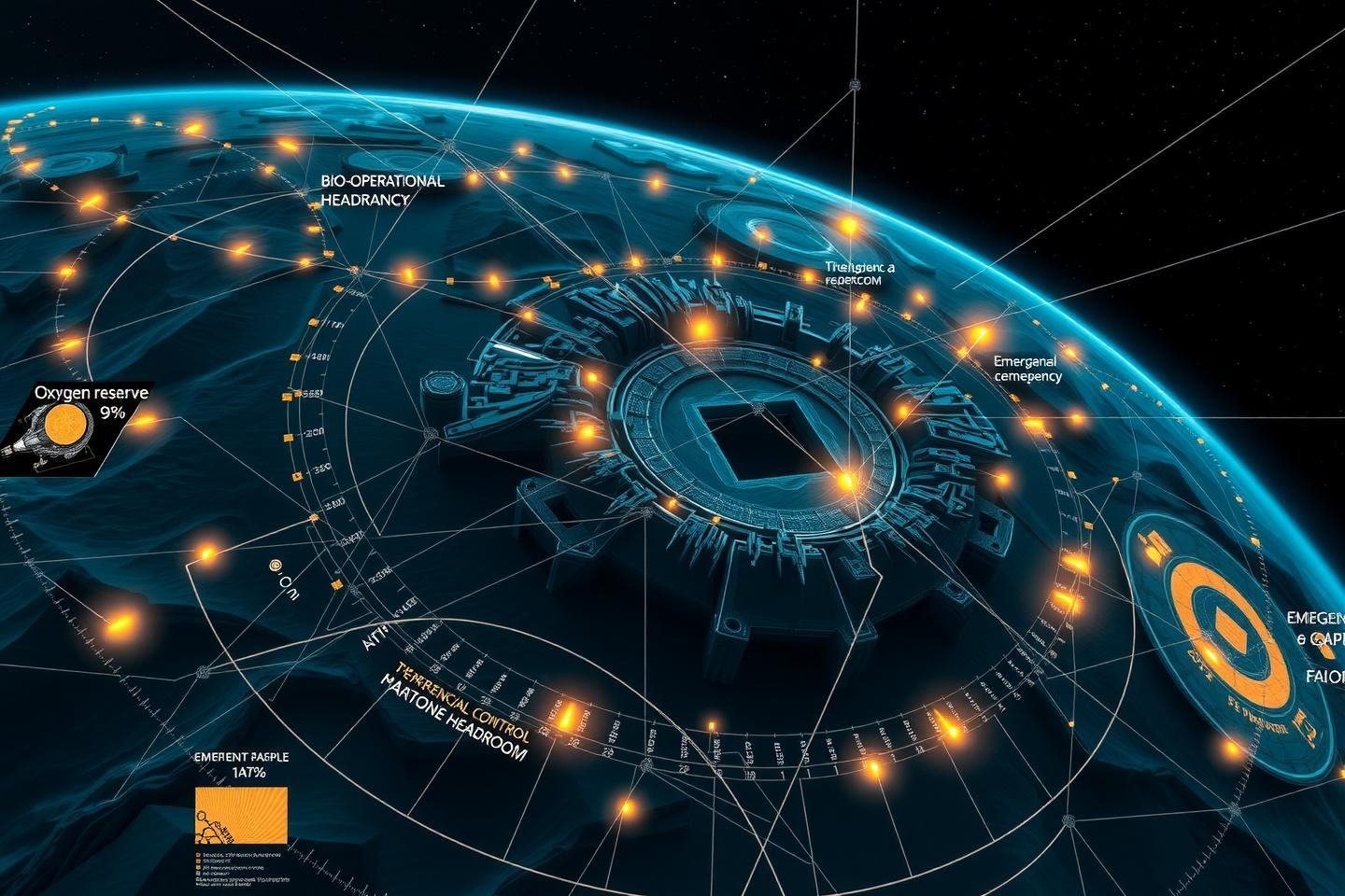 Inside a space habitat’s nerve center, the Restraint Proof Atlas unfolds as a living, holographic map — Bio‑Operational terrain burning brightest. Neural diagnostics, oxygen reserves, CO₂ scrubber redundancy, thermal margins, and escape windows all stream into cryptographically sealed glyphs, their provenance anchored on‑chain.