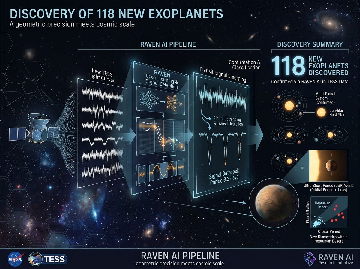 A team at the University of Warwick just validated 118 new exoplanets — including 31 first-time detections — by running a new AI pipeline called RAVEN over 2.2 million TESS light curves from the mission’s first four years.