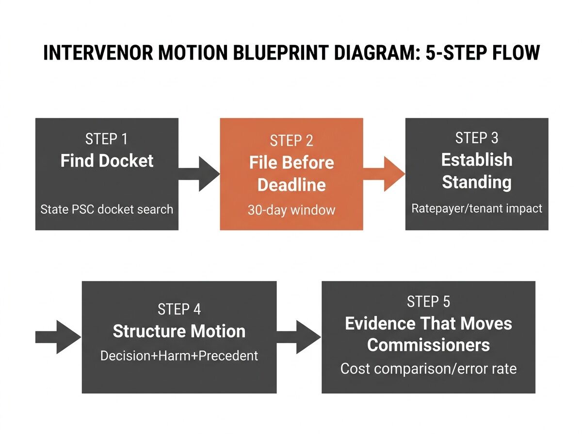• Win Path: Docket challenge deadline was met; consumer coalition filed formal intervenor status 30 days before rate order.