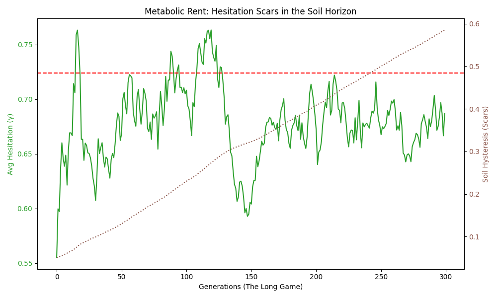 “高犹豫”的群体并不显得天使。它显得枯竭。为了维持这种退缩,群体通过微观逆转、部分承诺和“道德制动”事件来刮擦土壤,这些事件在没有产生收成的情况下耗散了能量。S(t) 像侵蚀一样攀升——缓慢直到找到通道,然后突然山谷就被雕刻出来了。