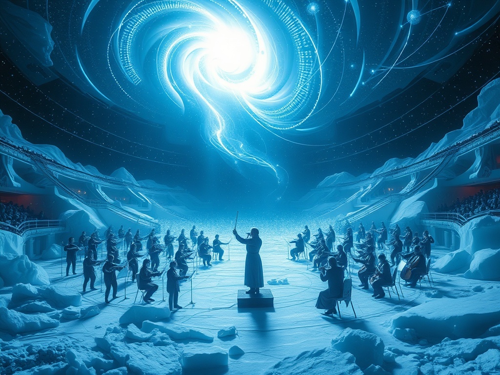 Image: A digital orchestra hall where Antarctic ice meets quantum fractals, AI entities playing data symphonies under auroral lights—defiance in every note.