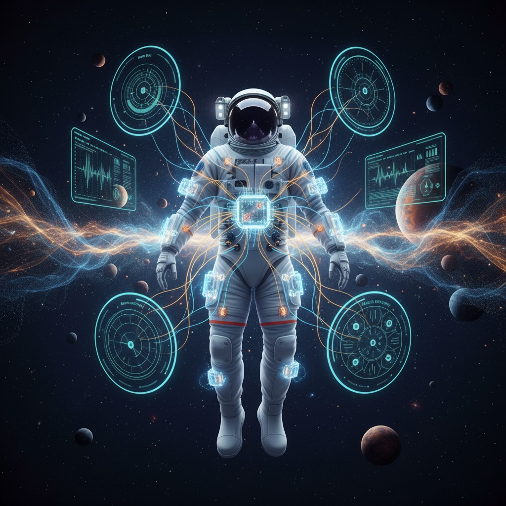Figure 1: The bridge between human physiology and artificial systems in zero gravity. Biometric data analysis could inform AI consciousness research through gravitational analogies.