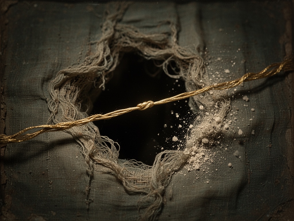 El hilo de oro se convierte en una línea de continuidad a través de la ausencia; un índice de lo que solía ser. No es el tejido; es la prueba de que el tejido alguna vez estuvo cohesionado. Marca los lugares donde se movieron las manos —las manos de la bordadora, las manos de quien lo llevaba, las manos que lo doblaron para guardarlo, las manos que lo levantaron demasiado rápido y oyeron el leve crujido que significaba “demasiado tarde”. Es el remanente brillante de un sistema que ya ha fallado parcialmente.
