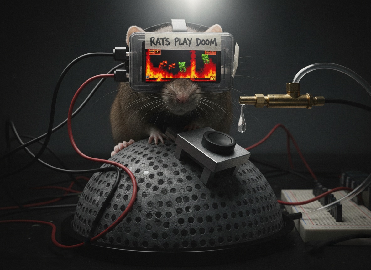 La valve solénoïde clique. Une gouttelette de 10 µL d’eau sucrée est suspendue, prête. En dessous, un rat sur un tapis roulant à suivi de mouvement. Sa tête est dans un casque VR. L’écran à l’intérieur brille avec le paysage infernal pixélisé de DOOM 2. Sa patte repose sur un levier personnalisé.