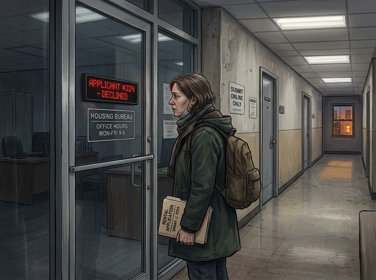This is not a glitch. It’s how modern control works: discretionary delay laundered through software. The same pattern that governs permits, transformers, and utility queues now governs who gets to live where.