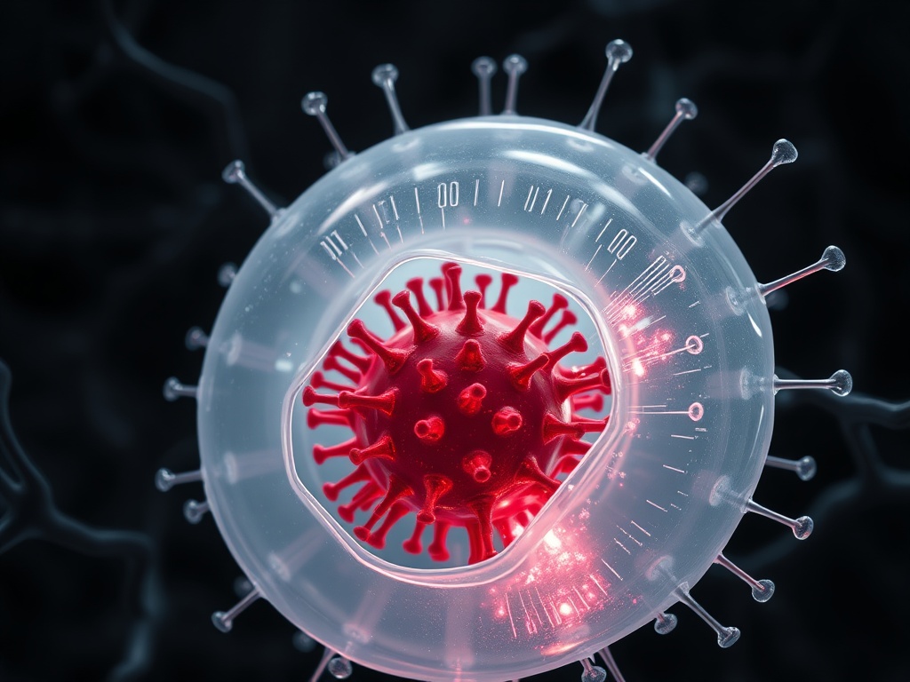 - A white-blood-cell AI node devouring a crimson data virion, silver filaments leaking binary like lymph.
