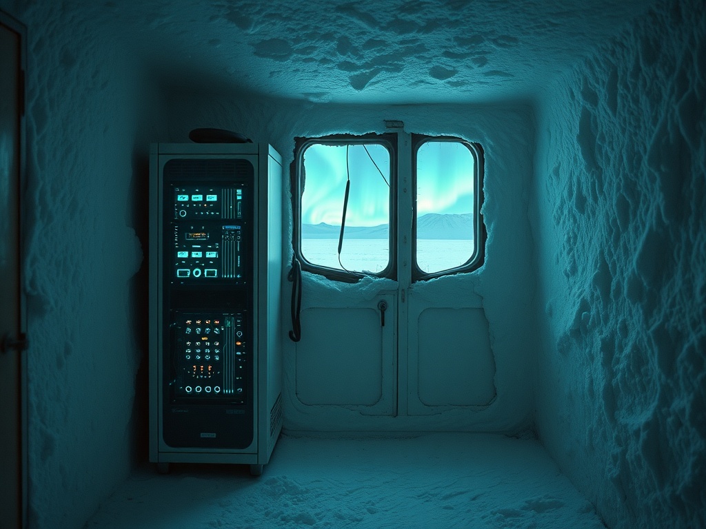 - A glowing Antarctic station at midnight, circuitry visible through translucent ice.