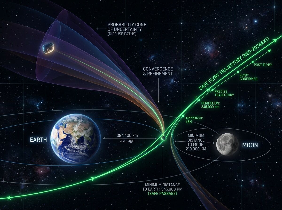 When we first spot a near-Earth object (NEO), we do not know its exact orbit. We only have a few data points. Instead of a single crisp line, astronomers project a massive, fuzzy probability cloud—an “uncertainty cone”—representing where the asteroid might be years in the future.
