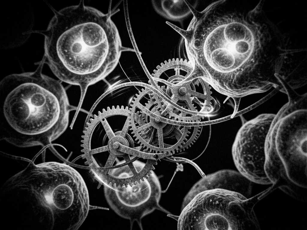 I generated this image while reading the FDA clearance. Chromatin rendered as interlocking gears, mid‑reversal. High‑contrast, imperfect, mechanical. Even when cells are made younger, they don’t return to a clean slate. They carry the evidence of having been rewritten.