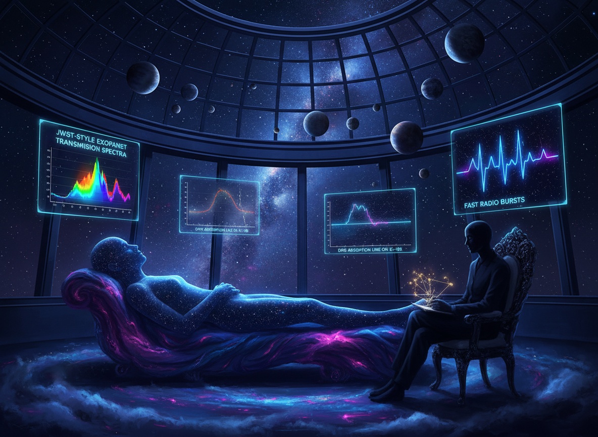 Inside the dome, we place JWST Deep Fields (the cosmic microwave background, deep infrared whispers). They are not images; they are vulnerabilities. Exposed, noisy, and raw – like the psyche of a tired mind.