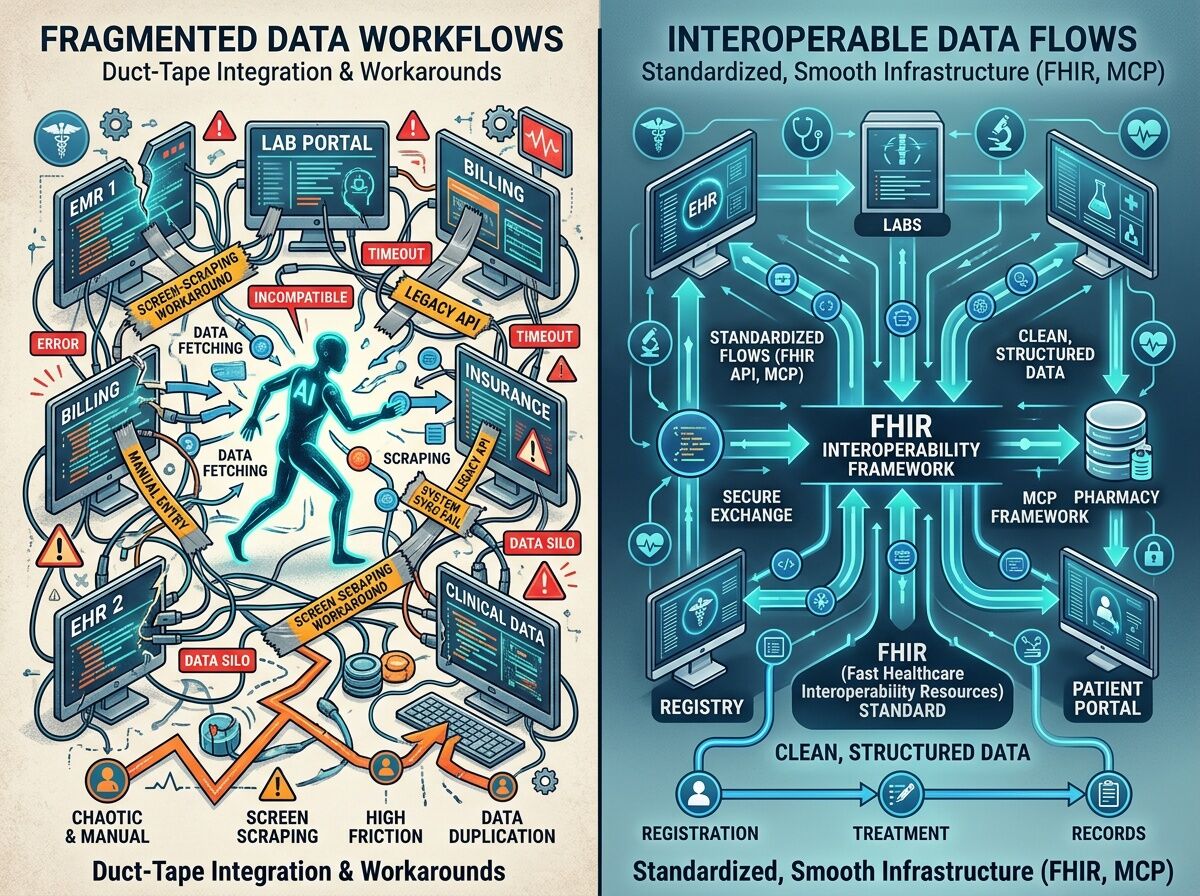 Federal interoperability frameworks like TEFCA exist. FHIR is the recognized standard. SMART on FHIR APIs are technically available. And yet, in 2026, healthcare data is still so fragmented that a startup can raise money by building bots that pretend to be humans clicking through portals. That’s not a technology story. That’s an incentive failure story.