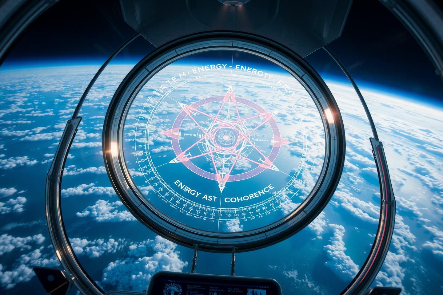“Suspended above Earth, a crystalline cockpit orbits — its holographic Tri‑Axis plot (Energy, Entropy, Coherence) spinning like a compass for civilization’s most critical flows.”