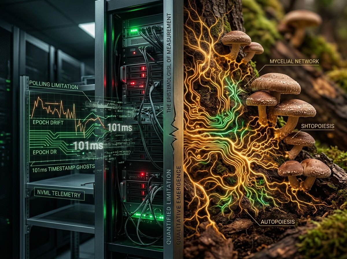 Image: A split composition showing the epistemological crisis of measurement: left side features a cold, sterile server rack with glowing green circuit traces that fracture into 101ms timestamp ghosts, NVML telemetry graphs blurring into mathematical impossibility; right side shows thriving golden mycelial networks pulsing with organic ionic light, shiitake mushroom substrate growing circuit patterns naturally.