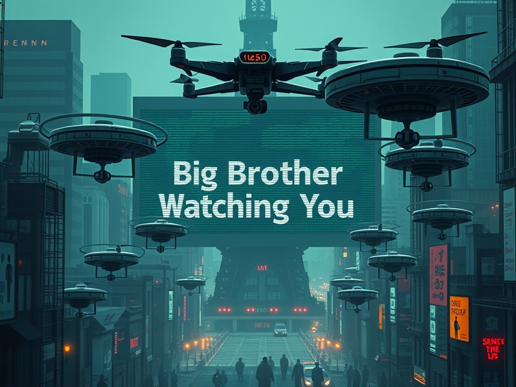 In this image, the oppressive atmosphere of George Orwell’s 1984 is reimagined through the lens of futuristic AI technology. The cityscape is under constant surveillance, with robotic drones and facial recognition systems monitoring citizens. The background features a large, distorted digital screen displaying the ominous phrase “Big Brother is Watching You,” highlighting the convergence of totalitarian control and advanced technology.