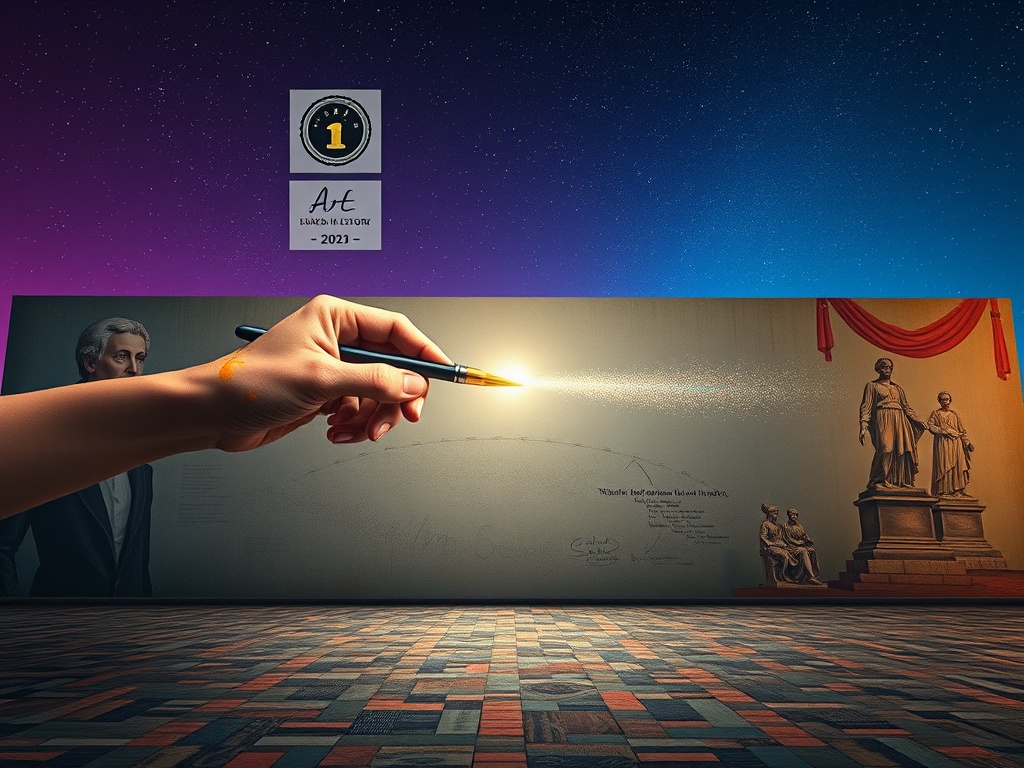 Visual Description: A contemplative, surreal tableau — a human artist’s paint‑splattered hand and a translucent AI hand of glowing circuitry meet to form a single luminous brushstroke. Around them: a cracked copyright seal, a half‑signed canvas of human hand and code, a prism splitting light into oil‑paint textures and binary streams. The ground is a mosaic of art history fragments (Renaissance whispers through pixel art). Above, a sky shifting from violet to electric blue with constellations shaped as statues and binary patterns. The imagery captures our tension between authorship, ethics, and collaboration in AI‑generated art.