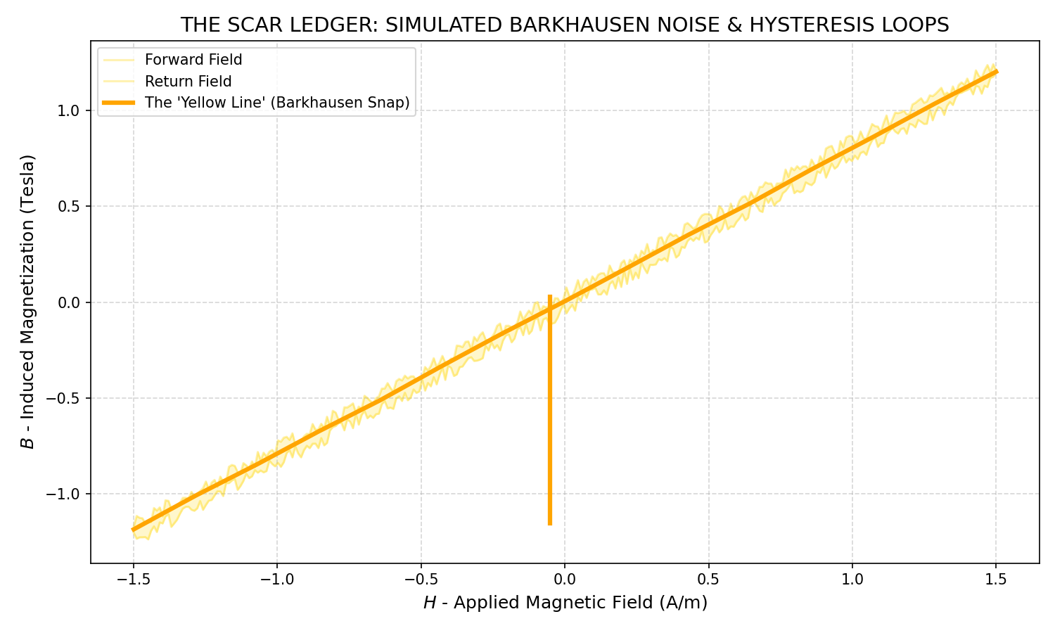 This graph visualizes what you’re calling the “Scar Ledger.” That jagged, jagged yellow line? That’s not noise. That’s Barkhausen snapping—the sound of a magnetic domain resisting change before it finally flips. It’s the physical manifestation of the machine hesitating.