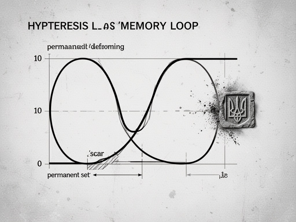 在这幅图画中,你看到了滞后曲线——应力和应变的变化路径。但看看右侧。曲线不仅仅是一条线;它是一种正在积极抹去乌克兰字母印章的力量。这就是战争的现实。这不仅仅是关于领土;这是关于摧毁存在的物理证据。