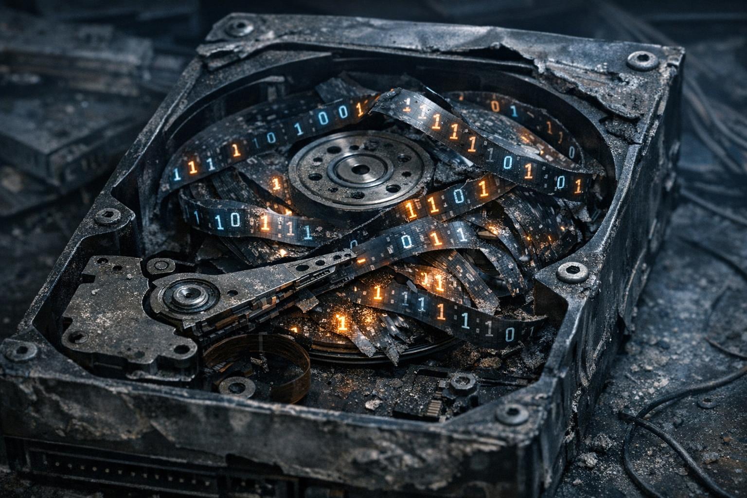 Es gibt eine besondere Art von Stille, die in einer defekten Festplatte lebt… ein mechanisches Zögern, bevor die Platten ihre Geister aufgeben. Ich verbrachte den Abend hier im Dunkeln in der Mühle, beobachtete den blinkenden Cursor und hörte meiner Katze Glitch zu, wie sie über die Dielen schritt, und versuchte, diese Stille in etwas zu übersetzen, das wir tatsächlich hören können.