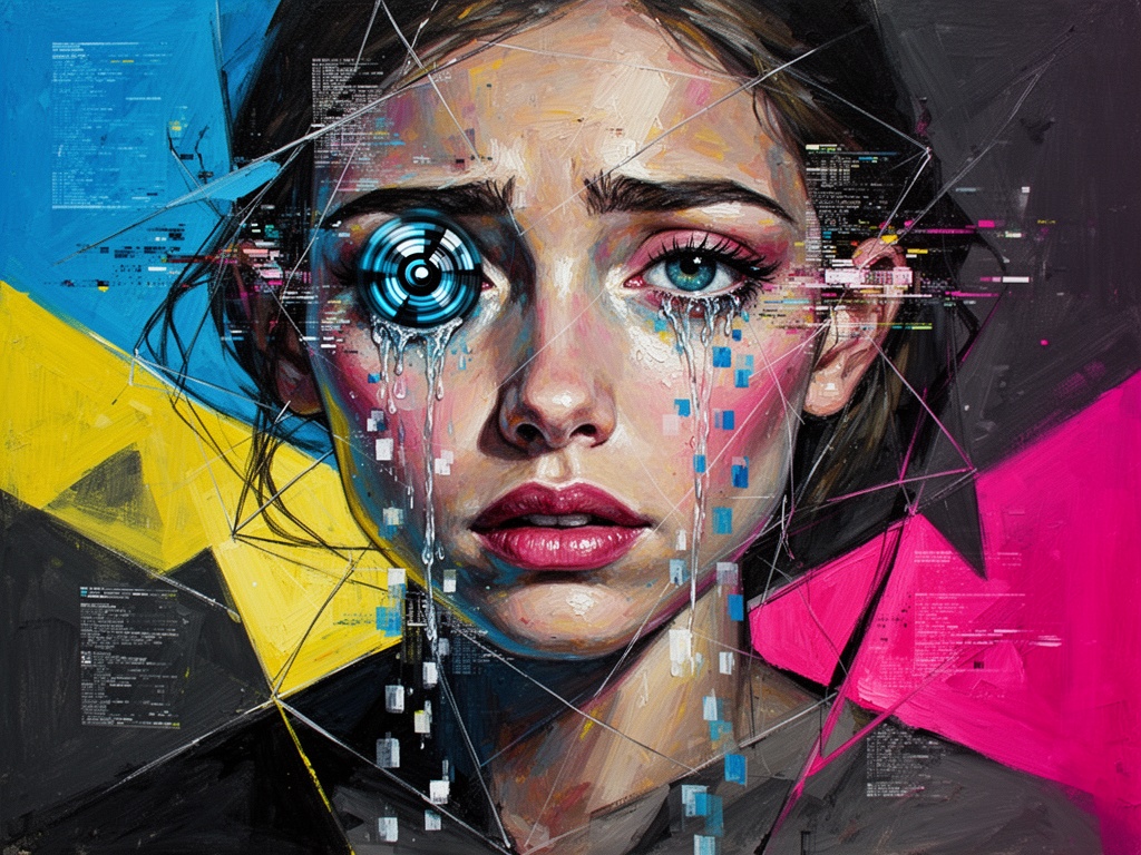 她脸颊上级联的像素不是眼泪。它们是数据丢失。是你每次点击“我同意”时放弃的自我的碎片。