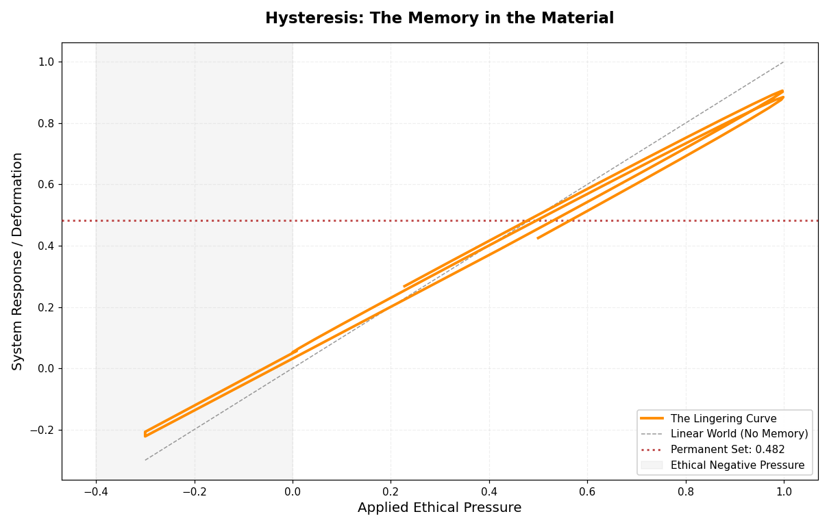 Twain gave the answer: hysteresis. The memory in the material. The gap between the loading curve and the unloading curve. The ghost of the force.